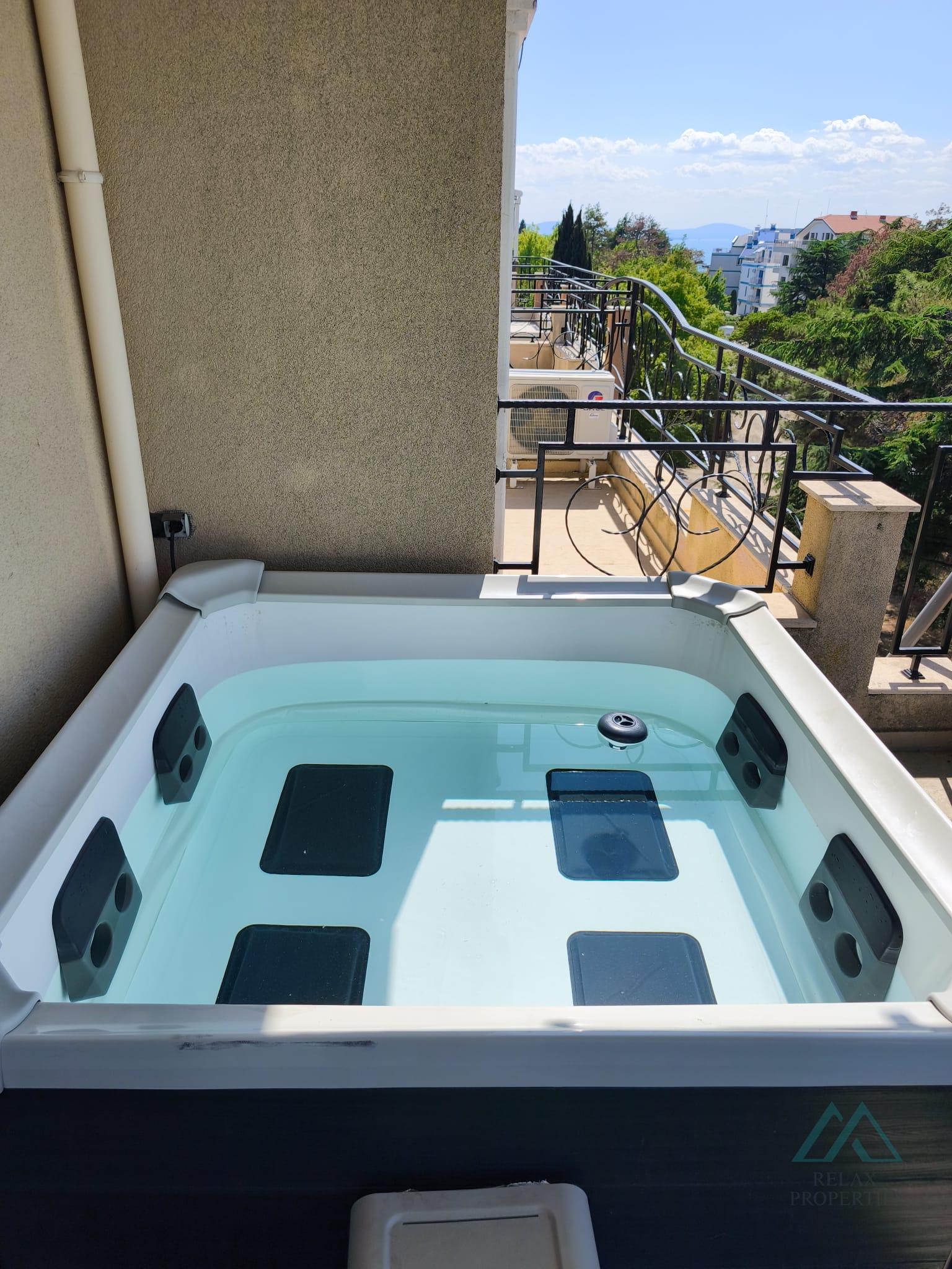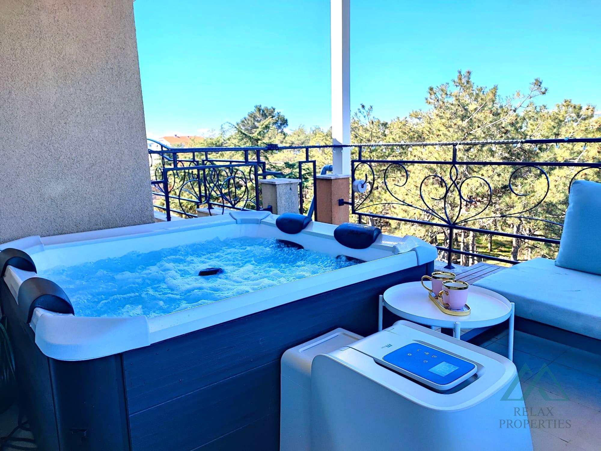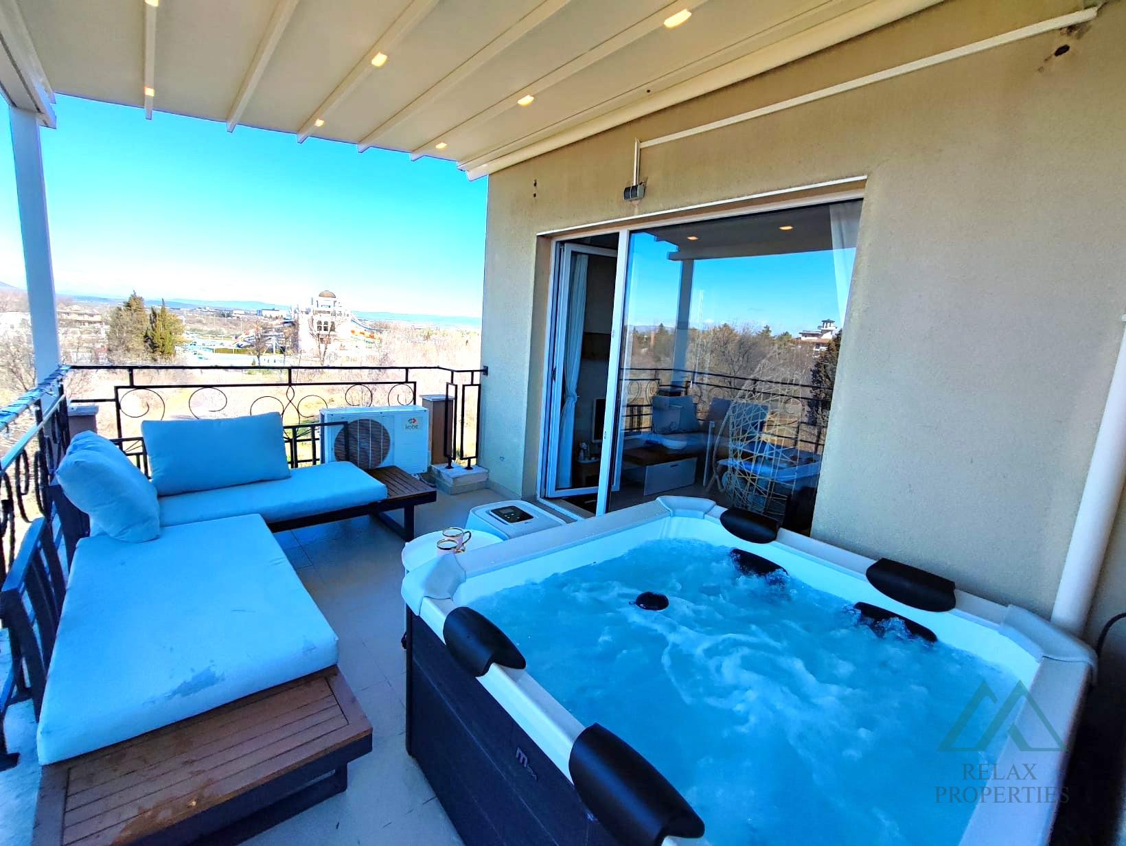 Popis nehnuteľnosti: obývacia izba s kompletne zariadenou a vybavenou kuchynkou, Útulná spálňa s prístupom na terasu, Kúpeľňa s toaletou – plne vybavená, Terasu s jacuzzi a novou diaľkovo ovládanou markízou s možnosťou pozerania letného kina. Panoramatický výhľad do okolia a čiastočný výhľad na more.