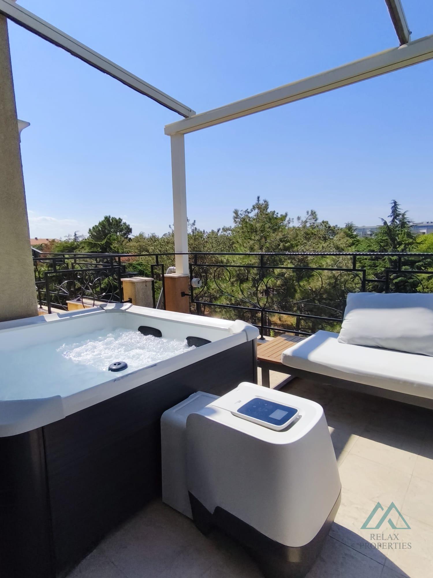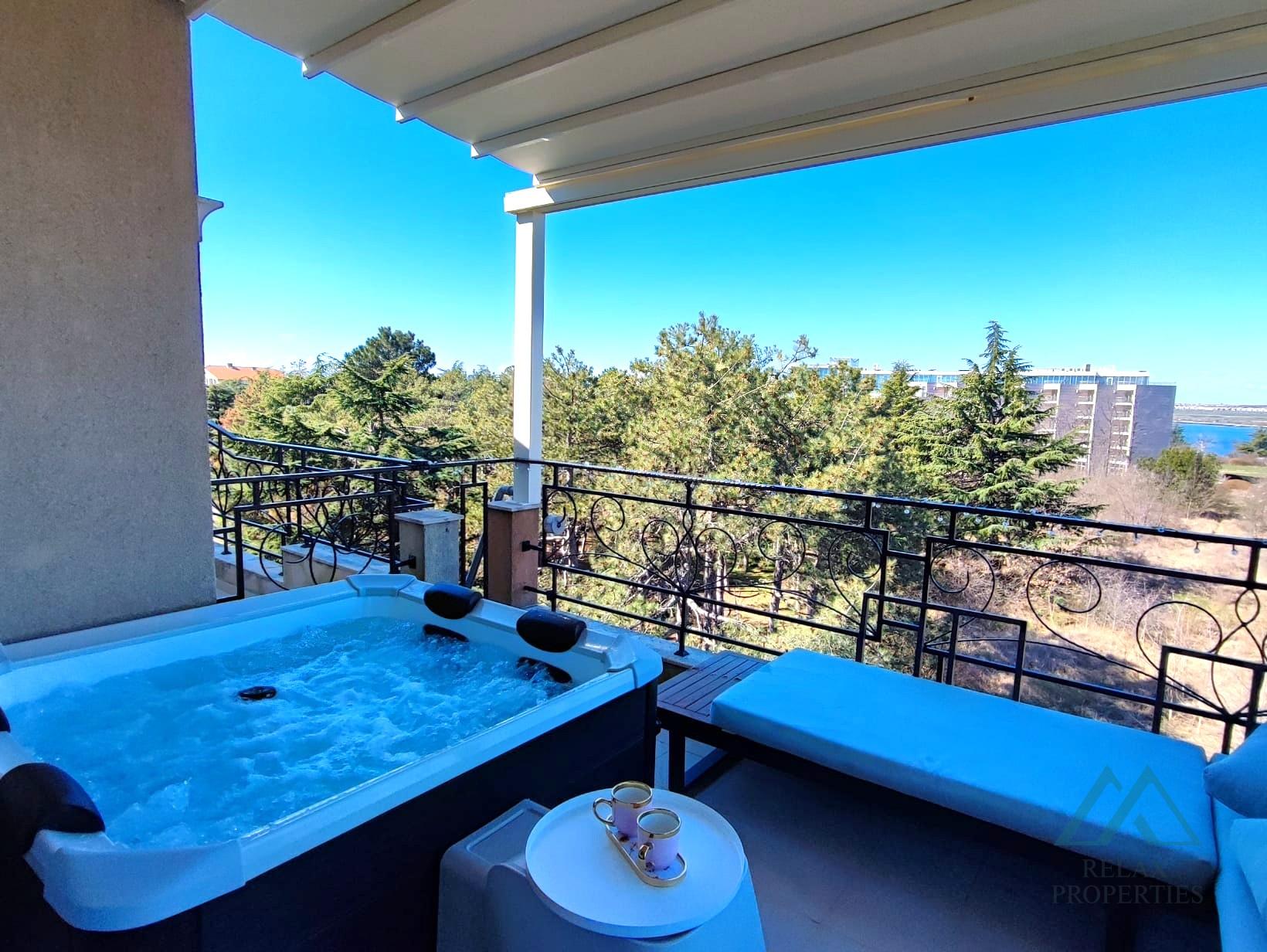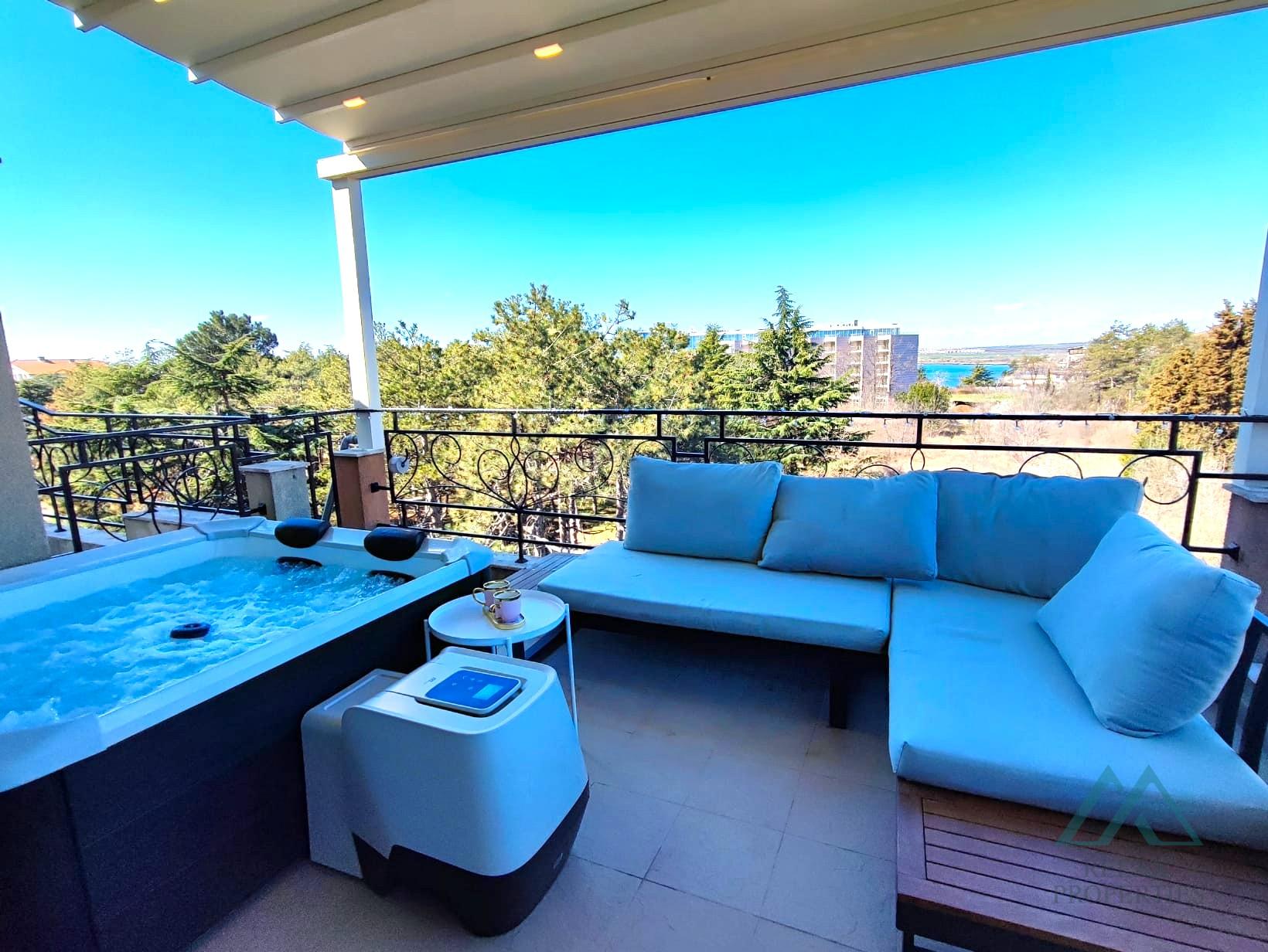 Popis nehnuteľnosti: obývacia izba s kompletne zariadenou a vybavenou kuchynkou, Útulná spálňa s prístupom na terasu, Kúpeľňa s toaletou – plne vybavená, Terasu s jacuzzi a novou diaľkovo ovládanou markízou s možnosťou pozerania letného kina. Panoramatický výhľad do okolia a čiastočný výhľad na more.