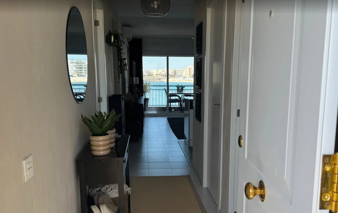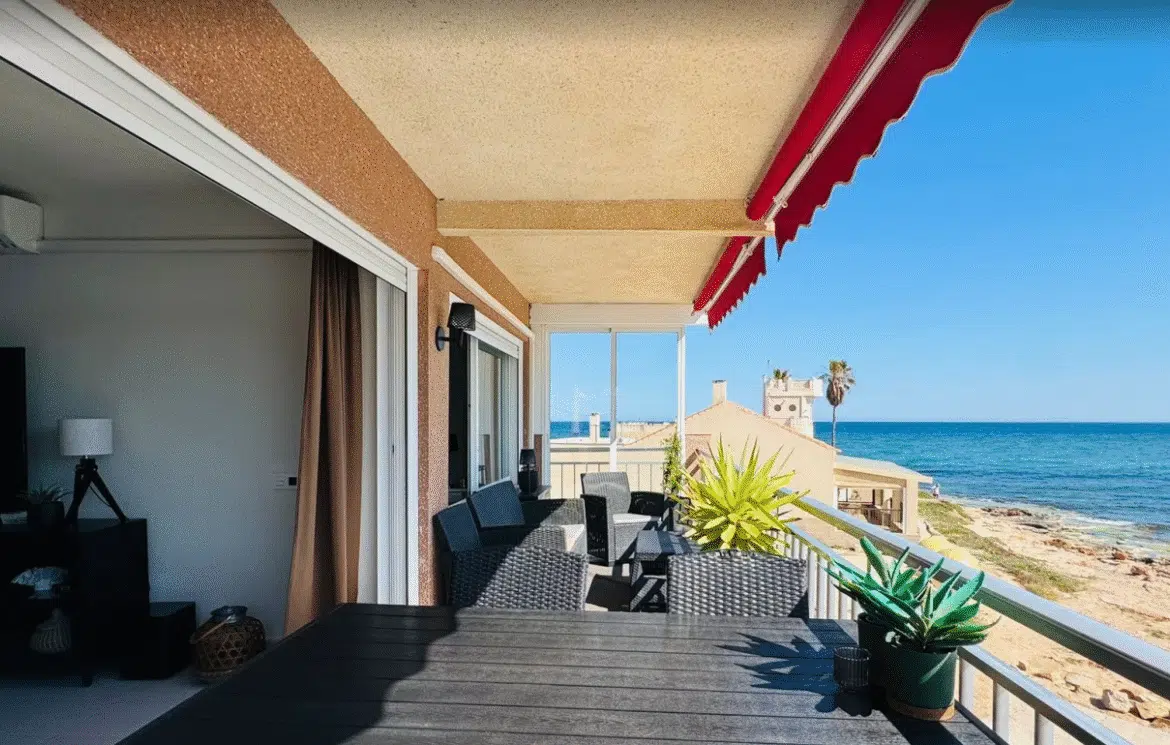Ponúkame na predaj výnimočný rohový apartmán v prvej línii pri mori, nachádzajúci sa priamo na promenáde jednej z najobľúbenejších pláží Torrevieje – Los Locos. Nehnuteľnosť ponúka nerušené panoramatické výhľady na more zo všetkých miestností a súkromný priamy vstup na pláž, čo z nej robí unikátnu ponuku na trhu.